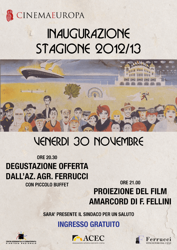 Ore 20.30, degustazione offerta dall’azienda agricola Ferrucci con un piccolo buffet. Ore 21.00, intervengono Luigi Lagrasta (presidente ACEC Emilia Romagna) e il sindaco. A seguire la proiezione del film AMARCORD di Federico Fellini. INGRESSO GRATUITO